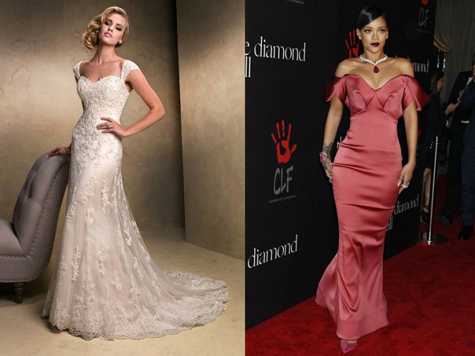 - Правильно подобранная модель поможет скрыть недостатки фигуры и подчеркнуть ее достоинства. Например, наряд с открытыми плечами подойдет девушке с типом фигуры груша. А девушки с фигурой песочные часы могут смело облачиться в платье русалка.
