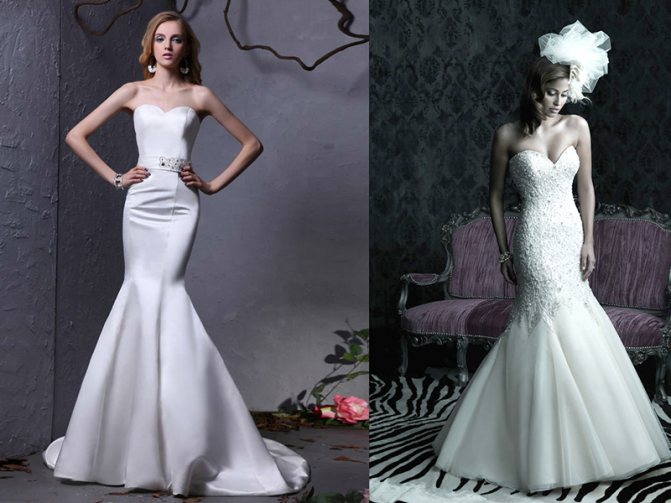 Представляя в воображении такой фасон, на ум сразу приходит свадебное платье-рыбка. Это уникальный наряд, делающий походку невесты более грациозной, мягкой и утонченной. Однако длительные прогулки и танцы в таком одеянии становятся невозможными, поэтому большинство невест покупают дополнительное облачение. Свадебное платье-рыбка с пышной юбкой дизайнеры дополняют бисером, жемчугом, стеклярусом, стразами Swarovski, создавая поистине королевский образ.