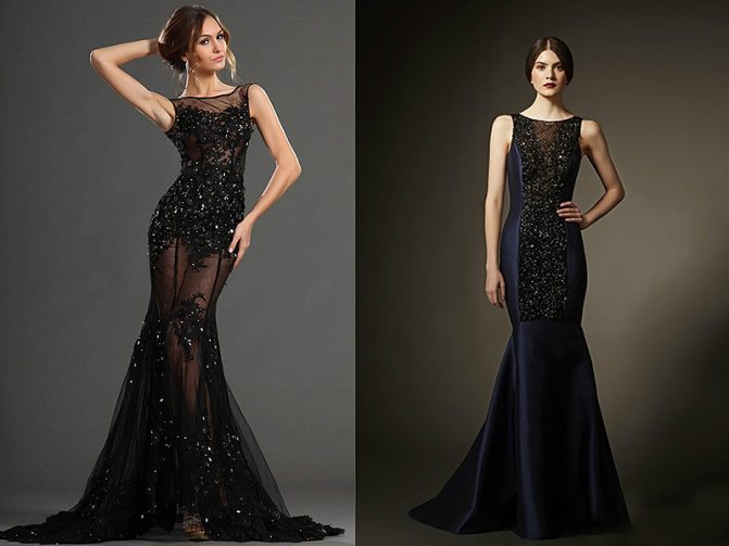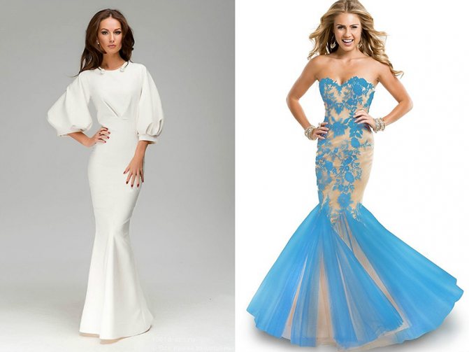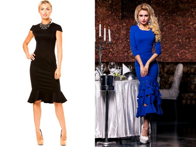 Вариации на тему «платье-рыбка» очень разнообразны. Значительно варьируется длина рукава и форма декольте. Благодаря этому удается регулировать степень обнаженности тела. «Русалка» с удлиненным рукавом и воротником выглядит не очень откровенно, при этом имеет свою изюминку. Актуален также вариант в виде декольте без бретелей и V-образная форма выреза.