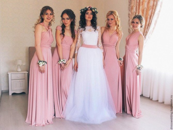 - Эффектность. Наряды подружек часто шьют на заказ: они должны быть стильными, красивыми, а созданный образ – целостным и гармоничным. Удачен будет выбор в пользу цветового единства – это поддержит необходимую праздничную атмосферу.