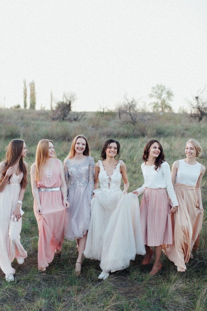 Кортеж подружек невесты – это западный обычай, который уже несколько сезонов набирает популярность в России. Если вы традиционалист, вы обязательно выберете для своей поддержки только одну девушку. Однако, если вы не придерживаетесь свадебных стандартов и у вас много сестер или друзей, и вы не можете выделить только одну из них, стоит подумать о выборе группы побольше. Тебе полегчает! Собравшиеся вокруг невесты похожие по внешности женщины – приятный акцент, который добавит позитивной энергии и свежести свадьбе и приему.