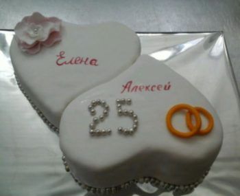 - Действие 4. Праздничный банкет. На столе в серебряный юбилей обязательно стоят хромированные или серебряные блюда. В меню может входить: ряба осетровых пород, дичь (утка, перепел, мясо кролика). Не стоит забывать про салаты, в летнее время они могут составить основную часть стола. Важны напитки: помимо любимого супругами вина или наливки на столе должны присутствовать соки и вода. Первый тост всегда за «молодых». Второй раз поднять бокалы можно за родителей или детей. Кульминаций может стать оригинальный торт в цвете юбилея.