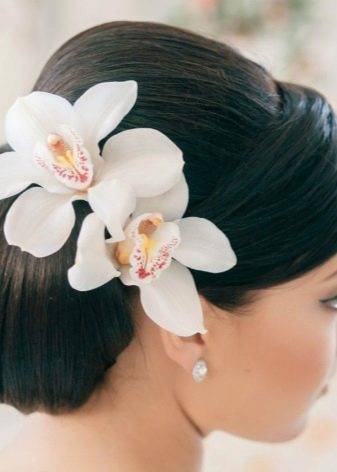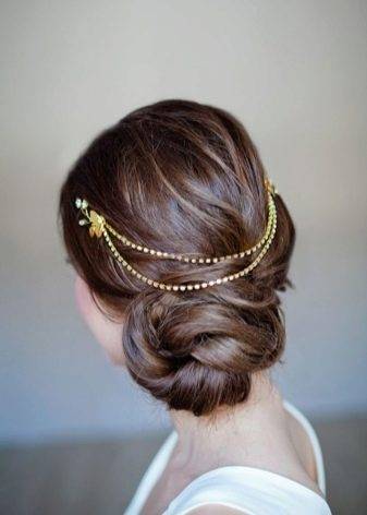 Строгую и элегантную прическу делают акценты в виде аксессуаров для волос.