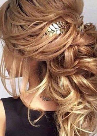 Еще один популярный аксессуар в создании торжественной прически – это обруч. Он может быть самых различных вариаций – широкий, тонкий, с блестками, атласной лентой или инкрустацией. Использование возможно, как дополнение практически к любой укладке, будь-то вариация плетения, пучка или распущенных локонов и хвостов.