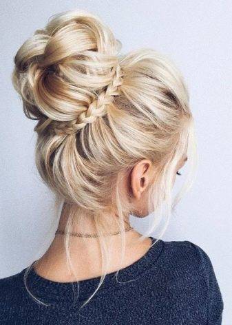 – несколько неожиданный выбор для свадьбы, но… Пучок из косы, украшенный цветами или стразами, смотрится очень достойно, а несколько ассиметричных пучков выглядят игриво и экстравагантно.