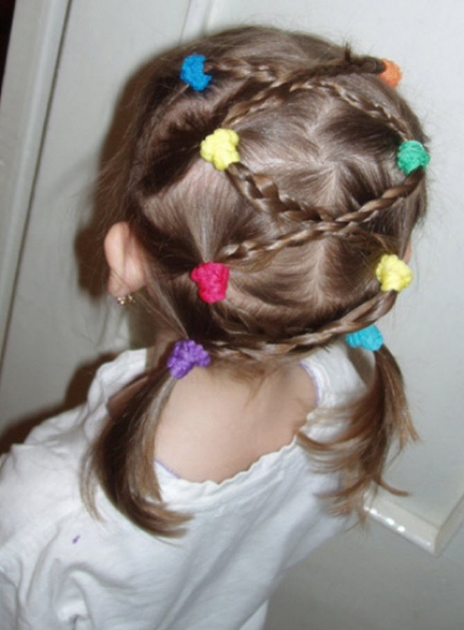Даже простые хвостики или косички будут смотреться намного нарядней, если украсить их аксессуарами. Большие красивые банты на хвостиках или атласные ленточки, вплетенные в косички, позволят сделать детскую прическу красивой.