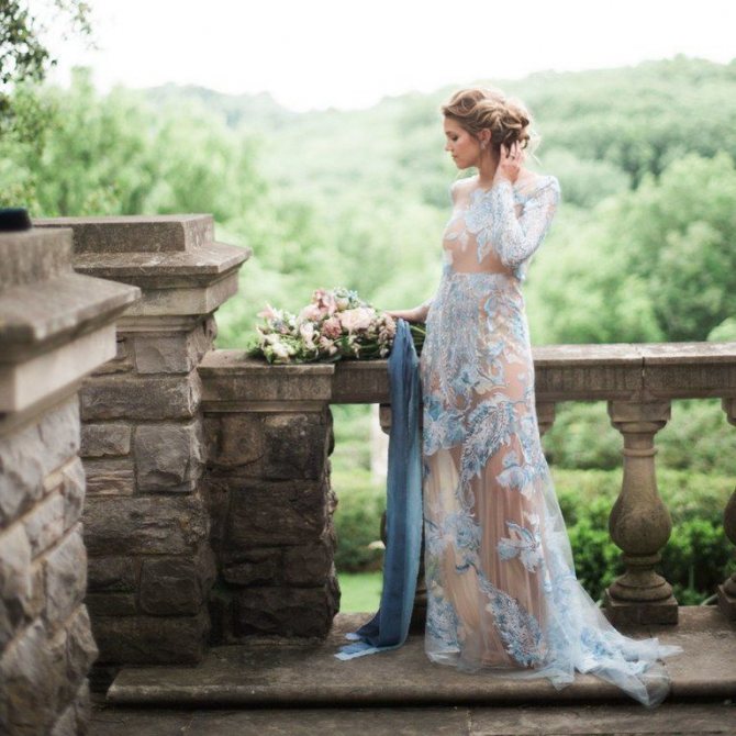Также популярностью пользуются наряды с капроновыми рукавами. Они позволяют скрыть мелкие недостатки кожи и в то же время подчеркивают загадочность, игривое настроение невесты. Капроновые рукава могут быть украшены вышивкой или кружевом.