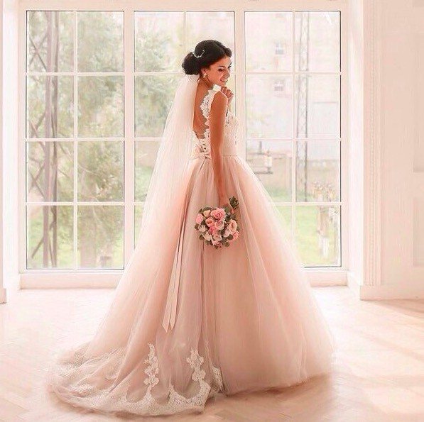Свадебное платье с пудровым оттенком – удачная альтернатива белоснежному наряду. Нежный кремовый оттенок легко сочетается с другими цветами. При этом он подойдет тем, кто не решается на радикальные изменения традиций.