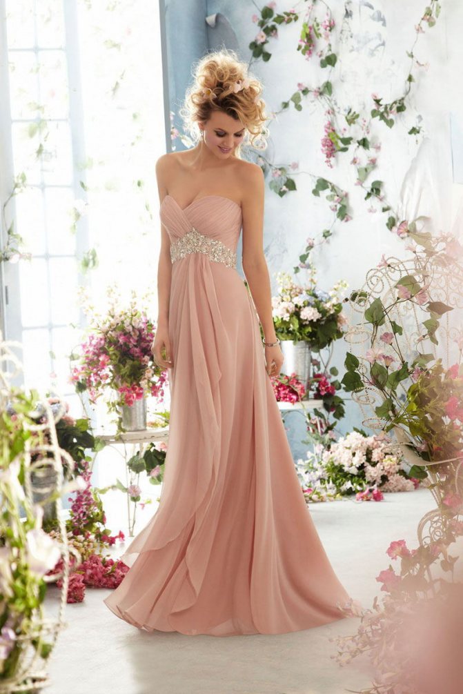 Пудровый наряд смогут дополнить романтичные локоны. Их украшением станут живые цветы или заколки, украшенные стразами. Классические фасоны платья сочетаются с высокими прическами – строгий пучок и конский хвост.
