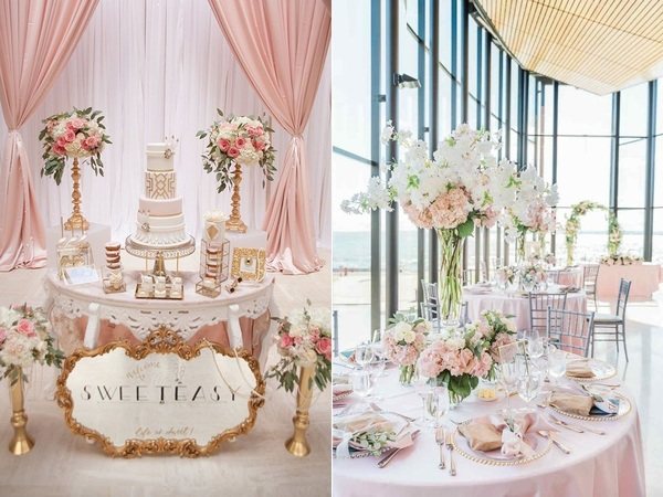 Нежный пудровый цвет на большом пространстве свадебного помещения может дать обратный эффект – из романтического помещение превратится в блеклое и невзрачное. А потому оформлению зала и декору необходимо придать особое значение.