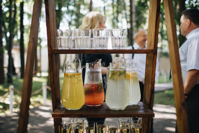 В теплое время года удели больше внимания легкому алкоголю, сокам и освежающим напиткам. В жару постоянно хочется пить, поэтому воды должно быть много. Рассчитав ее необходимое количество по формуле, прибавь 15-20%. Важно, чтобы официанты постоянно следили за наличием воды на столах. Можно дополнительно организовать лимонадный бар, чтобы гости сами могли наливать себе прохладительные напитки.