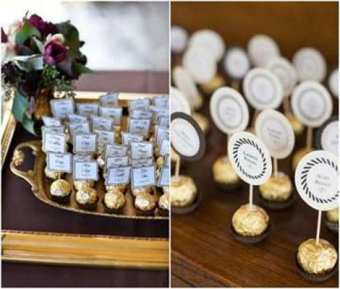 Конфеты с табличкой ставят на тарелку. Каждая конфетка – это не только украшение и угощение, но и подставка под держатель для карточки.