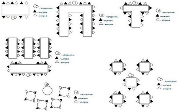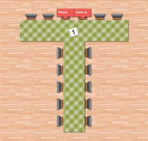 Т – образный способ предназначен для небольшой компании, не более 25 человек. В центре сидят влюбленные, по бокам свидетели, родители, родственники.