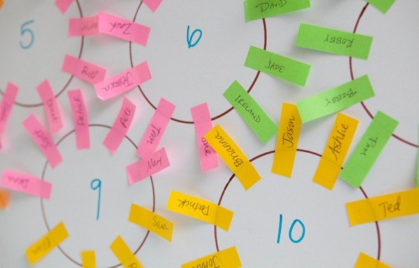 Делая общий план рассадки гостей, не вписывайте имена непосредственно в таблицу, а крепите их на стикеры, которые при необходимости можно снять и поменять на новые. Так вам не придётся переделывать весь план, если гости откажутся прийти или будет допущена ошибка.