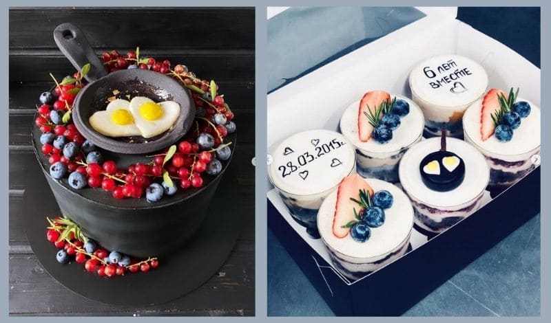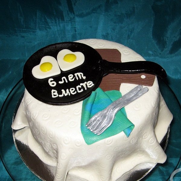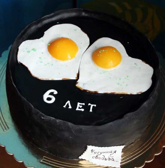 В конце застолья нужно преподнести гостям праздничный торт. Он должен быть полной противоположностью традиционному свадебному торту, который отличается пышностью и большим количеством взбитых сливок и свежих фруктов. Наоборот, торт для 6й годовщины должен по форме напоминать чугунок и сверху покрыт мастикой черного или темно-коричневого цвета.