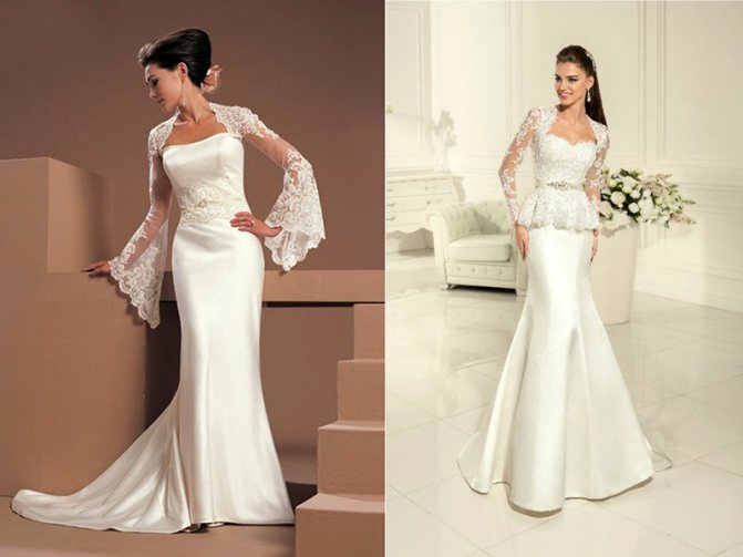 - Превосходно подойдет модное свадебное платье с рукавом. Только рукава должны быть длиной не меньше 3/4, потому как более короткие и объемные привлекут внимание к плечам.