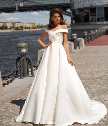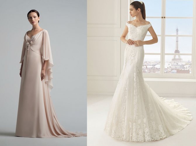 Идеально подойдут: пышное, короткое, а также прямое свадебные платья, платье А — силуэта, греческое свадебное платье, свадебное платье годе или «русалка».