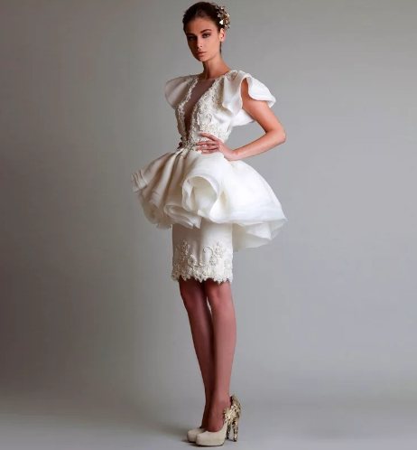 - Неплохо было бы показать и стройные ножки. Для этого можно остановить свой выбор на модном коротком свадебном платье с воздушными, прозрачными, легкими или просто расклешенными рукавами, смещая взгляд таким образом с талии на руки.