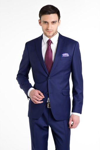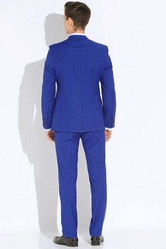 - Пиджак двубортный цвета электрик + синие прямые брюки + белая рубашка + васильковый галстук.