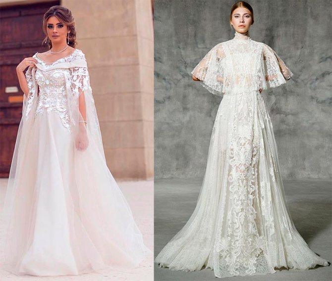Кейп немного напоминает пончо, но имеет четко очерченную линию плечей и прорези для рук. Что касается свадебного кейпа, он будет более воздушным, сшитым из легких струящихся тканей, и гармонирующим по цвету с самим свадебным платьем. При желании или необходимости кейп может быть и более утепленным. Если же нужен только эффект декора, а не согревания, можно использовать для пошива органзу, фатин, кружево, атлас и шелк.