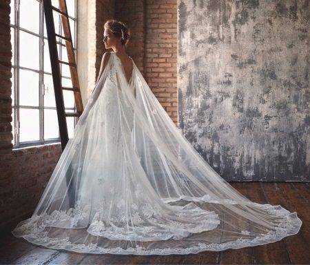Кейп станет удачным дополнением, если вы венчаетесь в церкви, а само свадебное платье достаточно открытое. В этом случае стоит использовать отдельную съемную накидку. Хотя многие дизайнеры очень удачно включили кейп в само платье, сделав его несъемным элементом. Такие элегантные «королевские» накидки для невест мы заметили на показах Randy Fenoli, Allison Webb, Berta, Marchesa Notte.