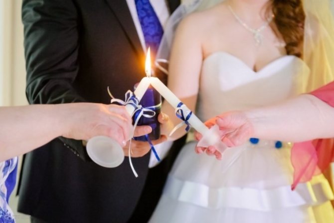 Свечи берут в руки только женщины, как хранительницы семейного очага. Мужчины выступают в роли защитника семьи. Невеста держит в руках свечу, а жених снизу поддерживает её руки. Отцы зажигают свечу, которую держит в руках их супруга.