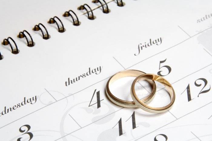 - Блокнот завели, теперь определяемся со сроками, то есть, назначаем дату свадьбы. У каждой пары имеются свои мотивы выбора той или иной даты: любимое время года, приуроченность даты другому событию (день рождения, свадьба родителей, годовщина знакомства и т. д.), особенности тематического оформления торжества (например, рождественский или хэллоуинский декор) или может, поджимают сроки, если у пары уже ожидается пополнение. Так, выбор даты свадьбы – дело индивидуальное. Единственное, что следует учитывать – это день недели, на который приходится эта дата. Это связано с: традициями, графиком работы ЗАГСов, церковными предписаниями.