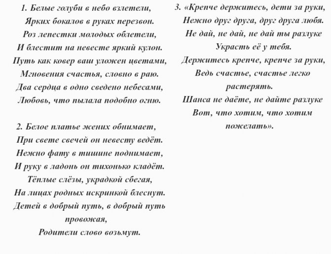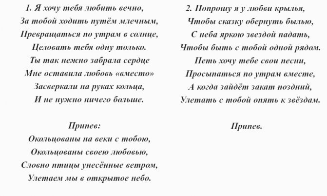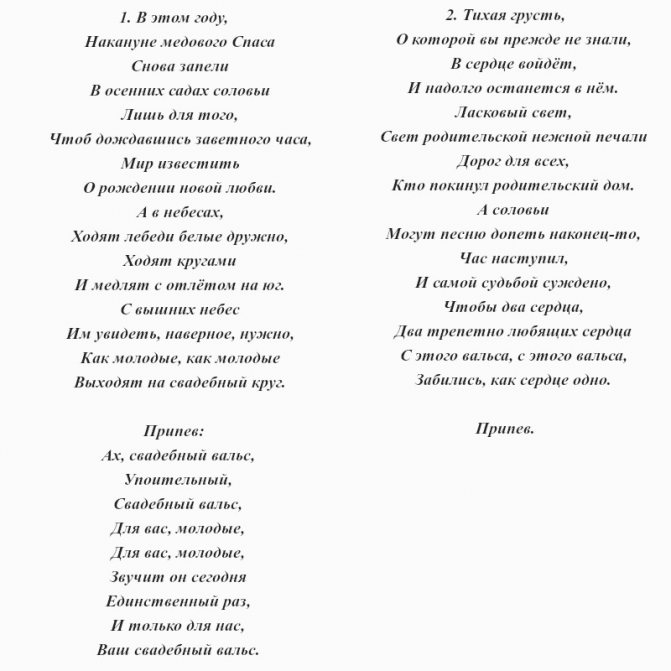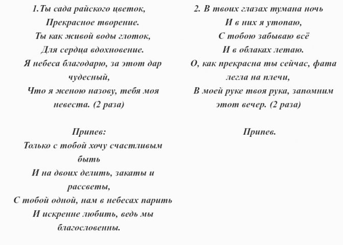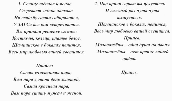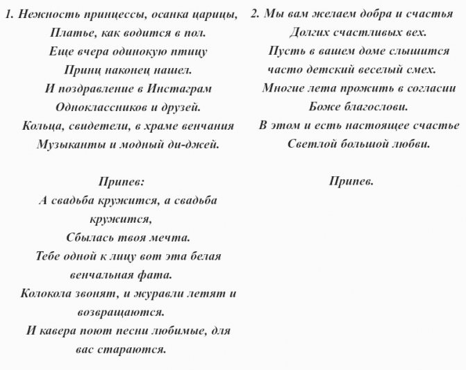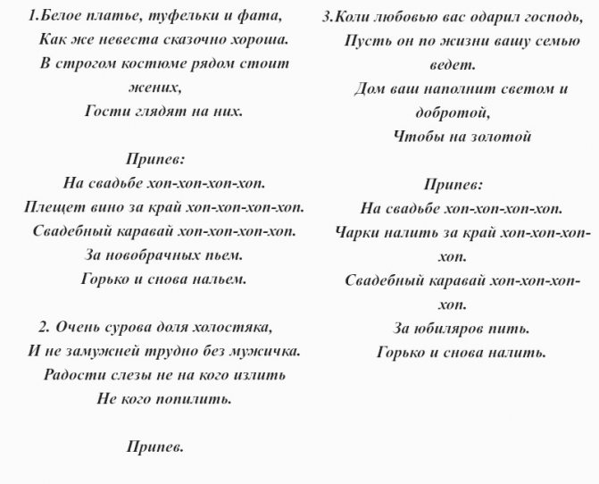 Припев Чтобы счастье шло в ваш дом, Чтобы хорошо было в нем! Терпеть, любить, желать Нужно вам теперь вдвоем. Скалка чтобы для пирогов, Можно и для врагов, И много нежных слов, Пусть подарит вам Любовь!