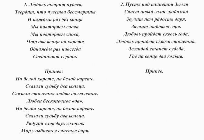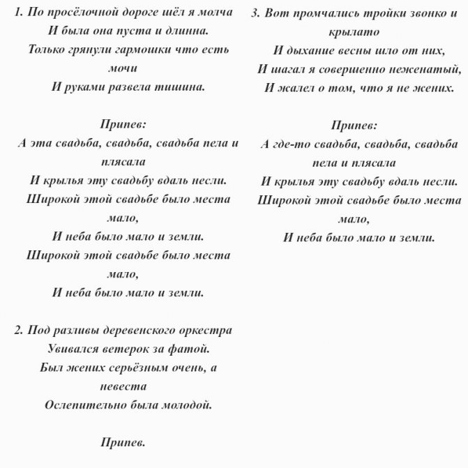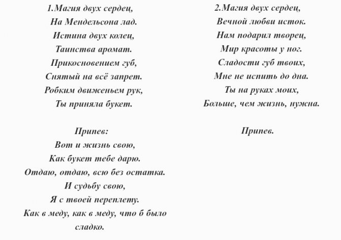 Припев Будет вам вдвоем не тесно, Не скучно вдвоем, А если вдруг чуть что, То друзей всегда позовем На рожденья дни, на пикник, На сытный обед, Придем и пожелаем счастия на много лет!