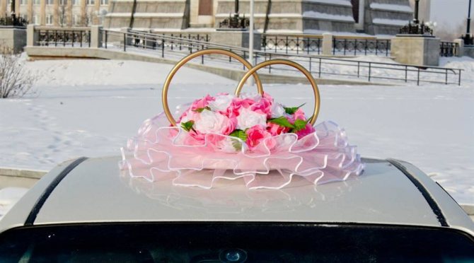 Закрепить конструкцию на крыше или капоте, багажнике. Украсить цветами, бантиками из лент. Можно добавить лебедей или котов.