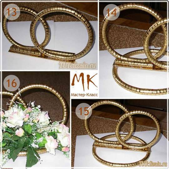 Обмотать кольца и основу лентой для декорирования цветов. Скотчем прикрепить кольца к основе. Такой свадебный аксессуар получится достаточно тяжелым. Чтобы придать устойчивости, к основе можно прикрепить еще одно кольцо.