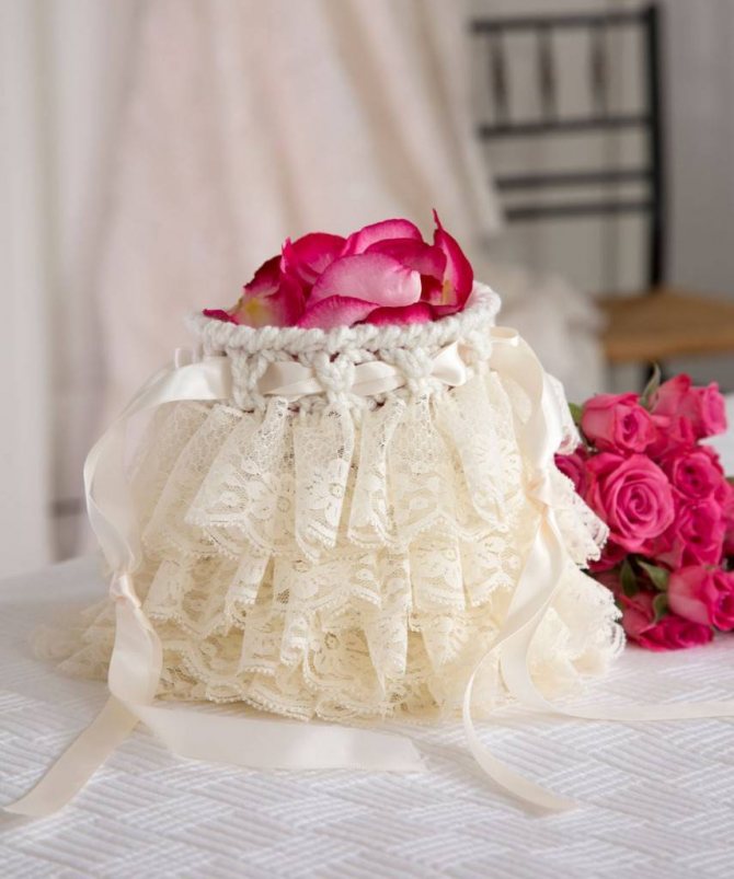 В качестве украшений подойдут: для сумочки кисета – полевые цветы или бусины; если свадьба в морском стиле, украшением послужат ракушки; оригинально смотрится кружево, бабушкина брошь, летом – бабочки; для холодного времени года годятся перья и искусственный мех.