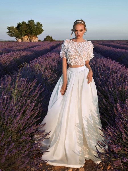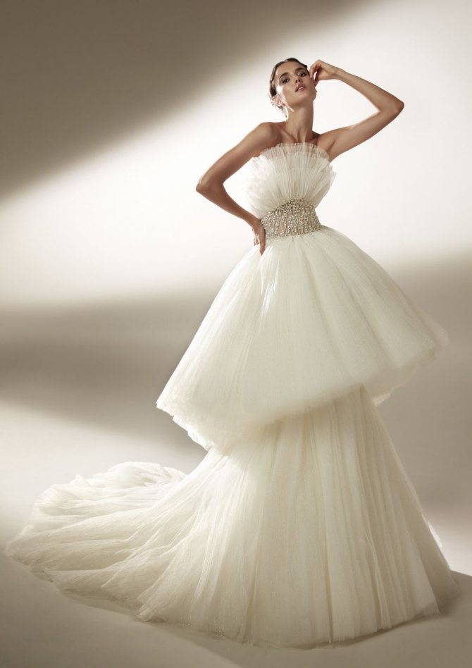 Помимо довольно классических силуэтом в коллекции встречаются смелые платья с многоярусными юбками. Такие варианты будут особеено выразительно смотреться на свадебных фотографиях.