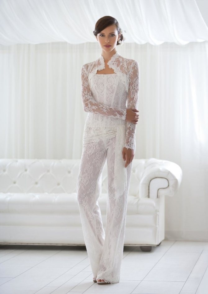 - Брючный костюм. Этот вариант для строгих невест или невест постарше. Брючный костюм может быть очень нарядным, но все же останется костюмом, а не платьем. Жених при этом тоже должен быть одет строго, в классическом стиле, чтобы соответствовать невесте.