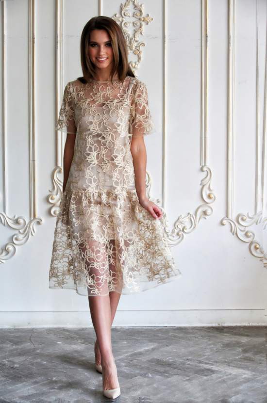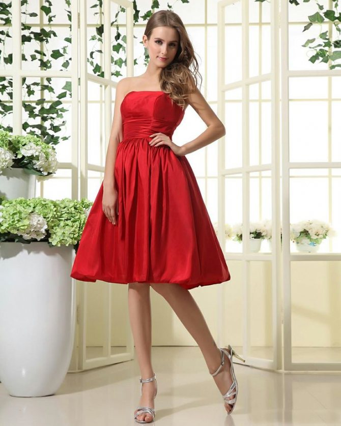 Платье А-силуэта с юбкой-пачкой и длиной чуть выше или чуть ниже колена. Струящаяся ткань поможет создать красивый силуэт и подчеркнуть все главные достоинства фигуры. Можно подобрать винтажный наряд, украшенный кружевами или вышивкой.