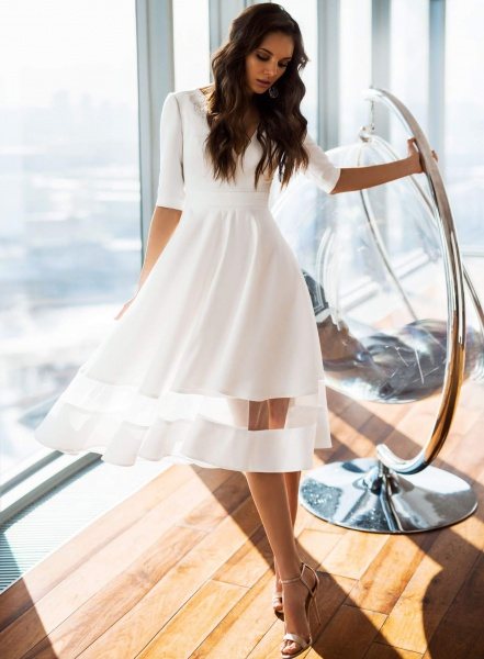 - Белое платье. Многие невесты все же предпочитают выходить замуж в белом, чтобы обозначить себя как невесту. Это не обязательно должно быть длинное пышное платье, можно выбрать более скромный вариант, платье-мини или ретро.