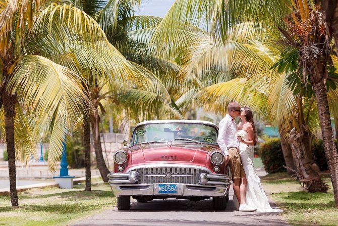 Причины выбора очевидны. Во-первых, тропический климат Кубы, с богатой на виды и яркой растительностью, уникальными представителями подводного мира, с которыми легко можно познакомиться, занявшись дайвингом, растянувшимися на многие километры белоснежными пляжами, разнообразными достопримечательностями и потрясающей атмосферой — отличное место для отдыха. Так что всегда можно рассматривать вариант совмещения свадебной церемонии и медового месяца. Единственное, исходя из температурных особенностей, высокой влажности и морских ветров, не рекомендуется надевать пышных и тяжелых платьев или классических темных костюмов.