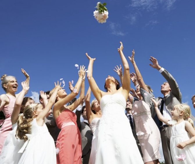 Получить подвязку невесты сулит удачу: это обычай, который восходит к семнадцатому веку, когда незамужние гости должны были любыми способами завладеть подвязкой невесты. Со временем этот обычай изменился: теперь подвязку, как и букет, бросают в толпу, делает это жених, чтобы невеста не повредила свое роскошное платье. Если же невеста не надела подвязки, в толпу незамужних бросают правый туфель невесты.