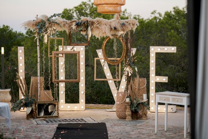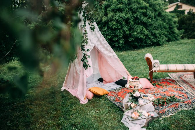 Не забывайте про природные элементы: цветы, дерево, колосья, сухоцветы. Также для богемного торжества характерна винтажная мебель, гамаки, множество подушек, пледов, ваз и посуды из цветного стекла. Для оформления помещения или территории можно использовать старые сундуки и чемоданы, музыкальные инструменты и флажки из состаренной бумаги. А после захода солнца добавит романтики свет десятков огоньков от развешанных повсюду гирлянд.