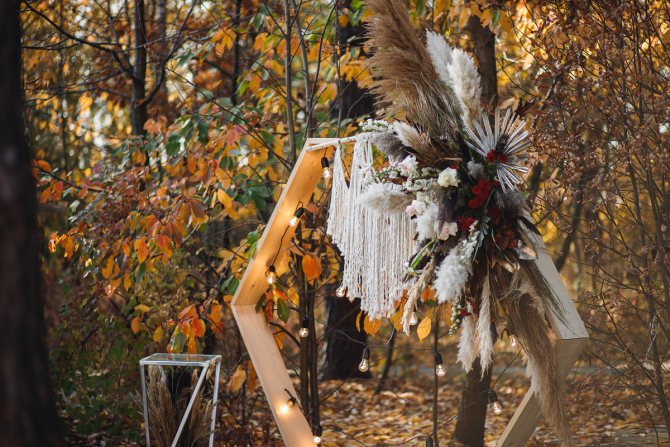 При выездной регистрации важным моментом станет оформление арки. В отличие от классического торжества, арки для свадьбы в стиле «Бохо» отличаются своей неправильной, грубоватой формой.
