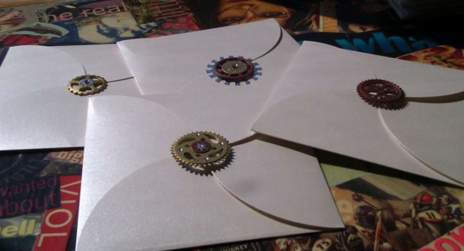 Необходимо разослать необычные пригласительные на свадьбу. К созданию пригласительных необходимо отнестись со всей серьезностью, так как это своего рода визитная карточка свадьбы. Самый простой и дешёвый вариант – это пригласительные открытки, украшенные шестерёнками и стрелками от часов, которые направлены на время и дату торжества. Более дорогие, но и памятные для гостей, будут пригласительные в виде миниатюры глобуса, компаса или часов, на которых будет выгравировано время, дата и место проведения торжества.
