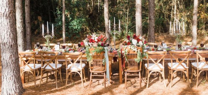 : это могут быть и плетеные корзины, в которых расположились флористичесие композиции, и пеньки деревьев вместо стульев.