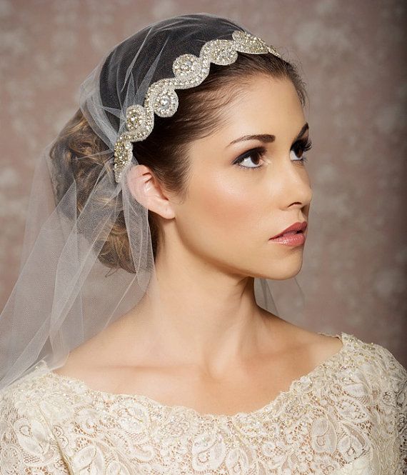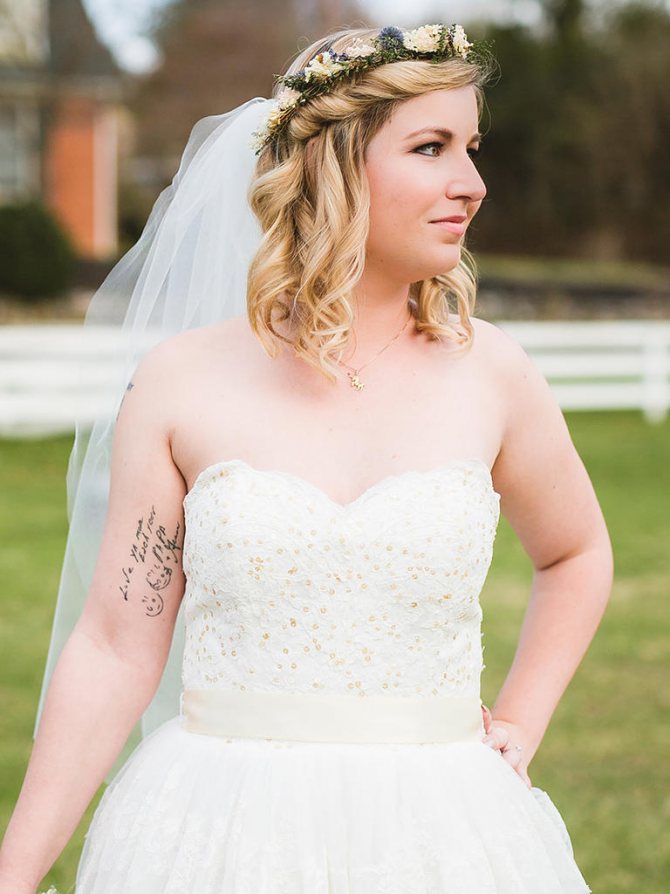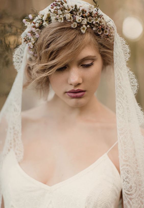 Свадебная прическа с короткой фатой подойдет истинным принцессам, под греческие стили свадьбы, может обрамляться венком из цветочков. Также с голивудскими локонами подобный образ будет кстати.