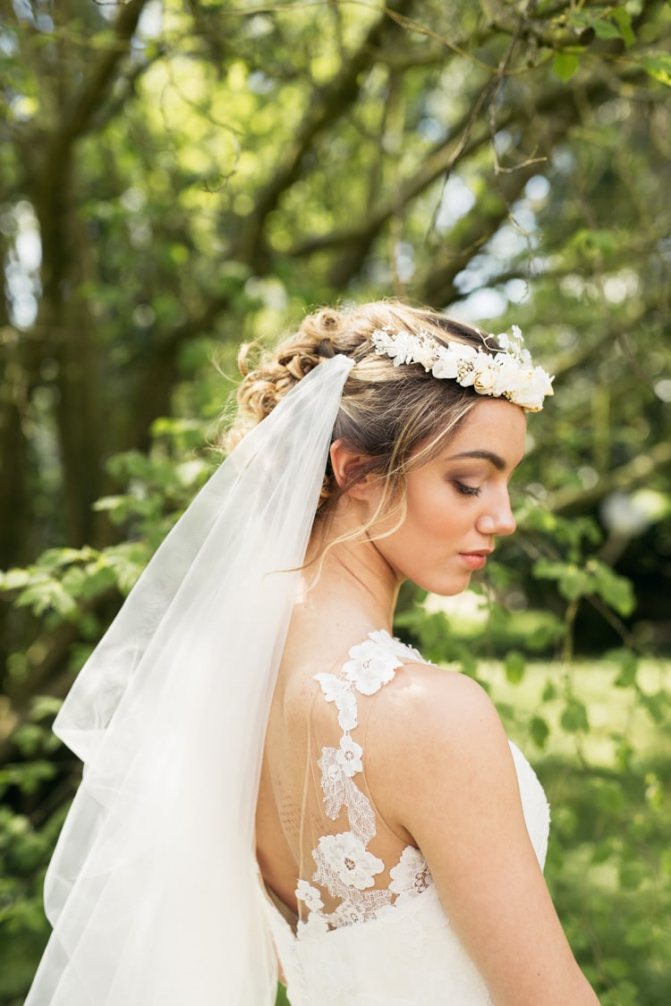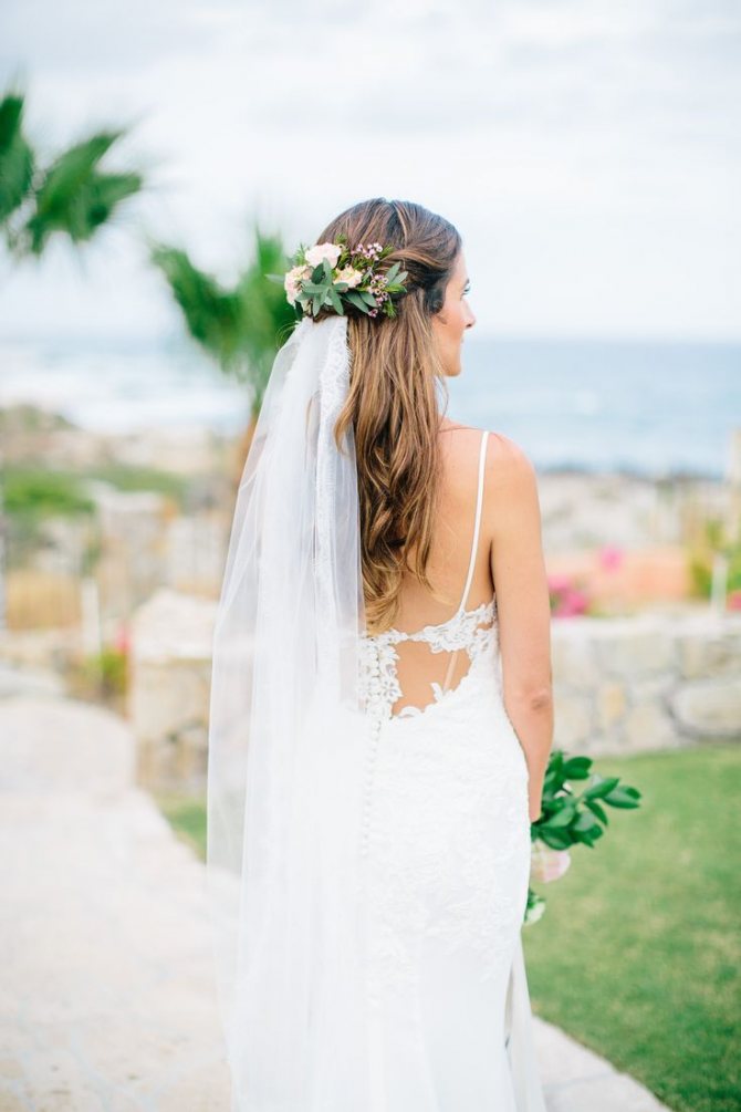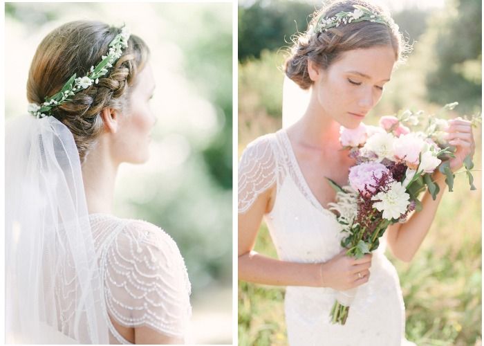 Легкая вуалька гармонирует с цветами или венком, собранные волосы в прическе не будут вылезать в разные стороны.