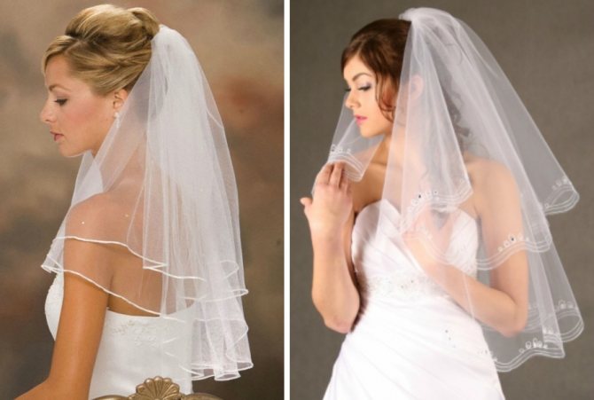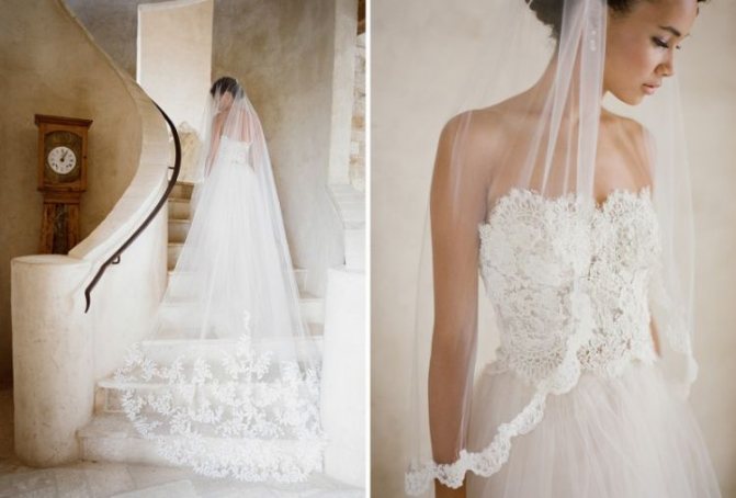 Если головное покрытие до локтя, оно считается универсальным, то фата, что доходит до кончиков пальцев, подойдет даже к короткому платью.