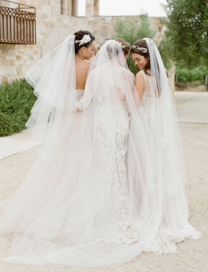 На венчание выбирается очень длинная фата, можно даже взять ее со шлейфом, но необходимо понимать, что это доставит некоторые неудобства. Смотрится модель элегантно с красивым и шикарным нарядом, где много украшений и страз.