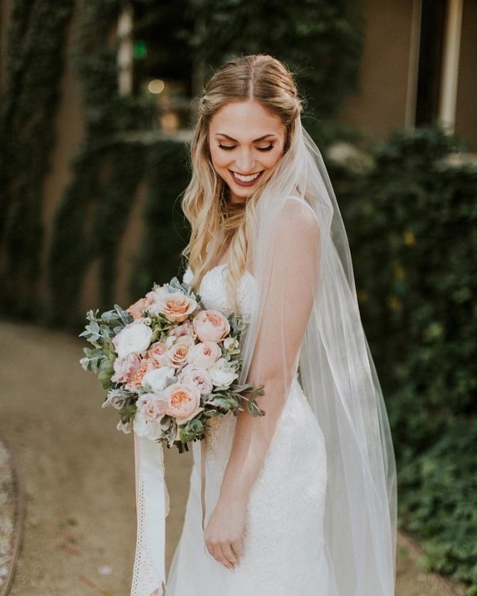- Классический вариант – гладкие локоны, прикрытые красивой фатой;