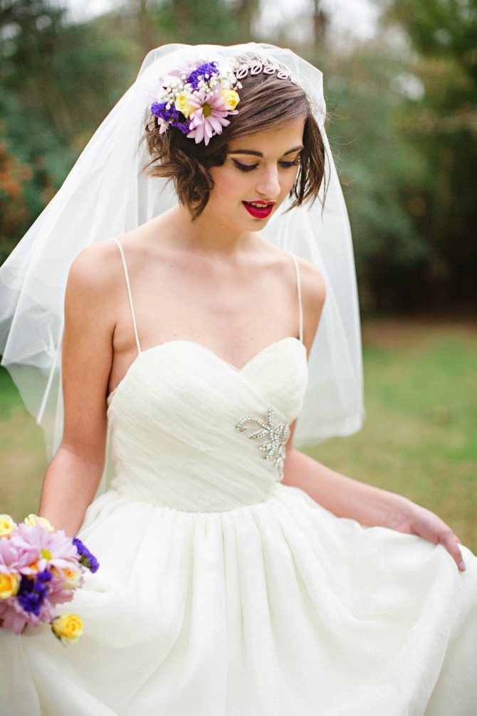 Для коротких волос используют один-два крупных бутона и закрепляют их с помощью заколок. Фата должна быть однослойной, чтобы не перегружать образ деталями.