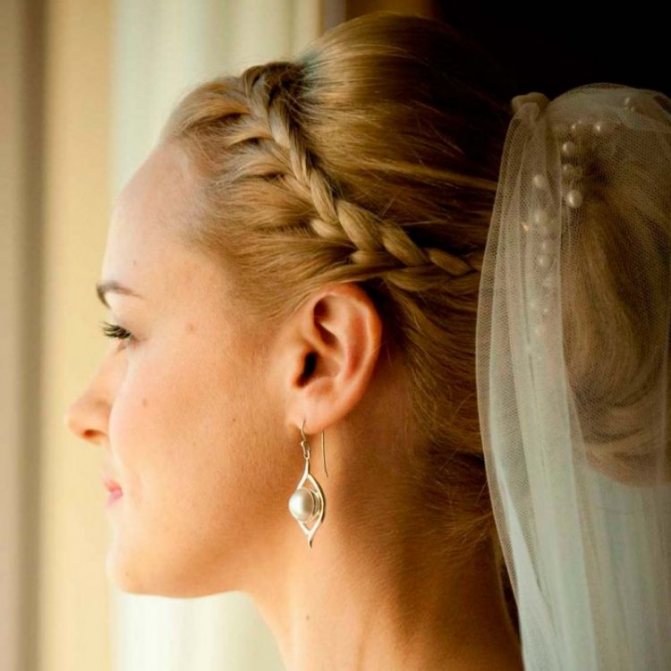 Греческая коса собирается из слабо стянутых локонов от затылка. Отличительные черты – лёгкая небрежность в укладке и естественность. Фата крепится у основания косы. Можно украсить её вышивкой или кружевом.