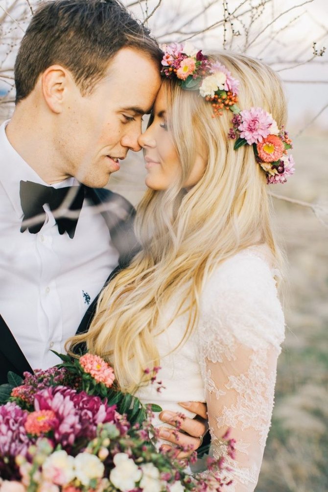 В богемных прическах можно позволить себе отступить от общепринятых правил и оформить локоны яркими цветочными букетами или нарядным венком